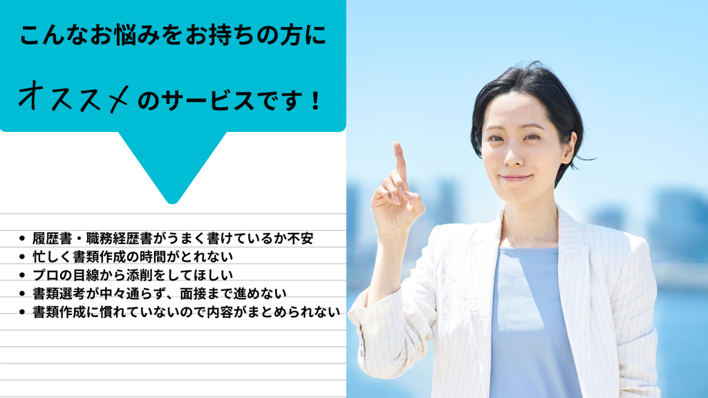 書類作成に時間をかけていませんか?プロと一緒に進めることで悩む時間が軽減され、働きながらの転職活動も効率的に進めることができます。仕事が忙しくて書類作成に割く時間がないという方にもおすすめのサービスです。